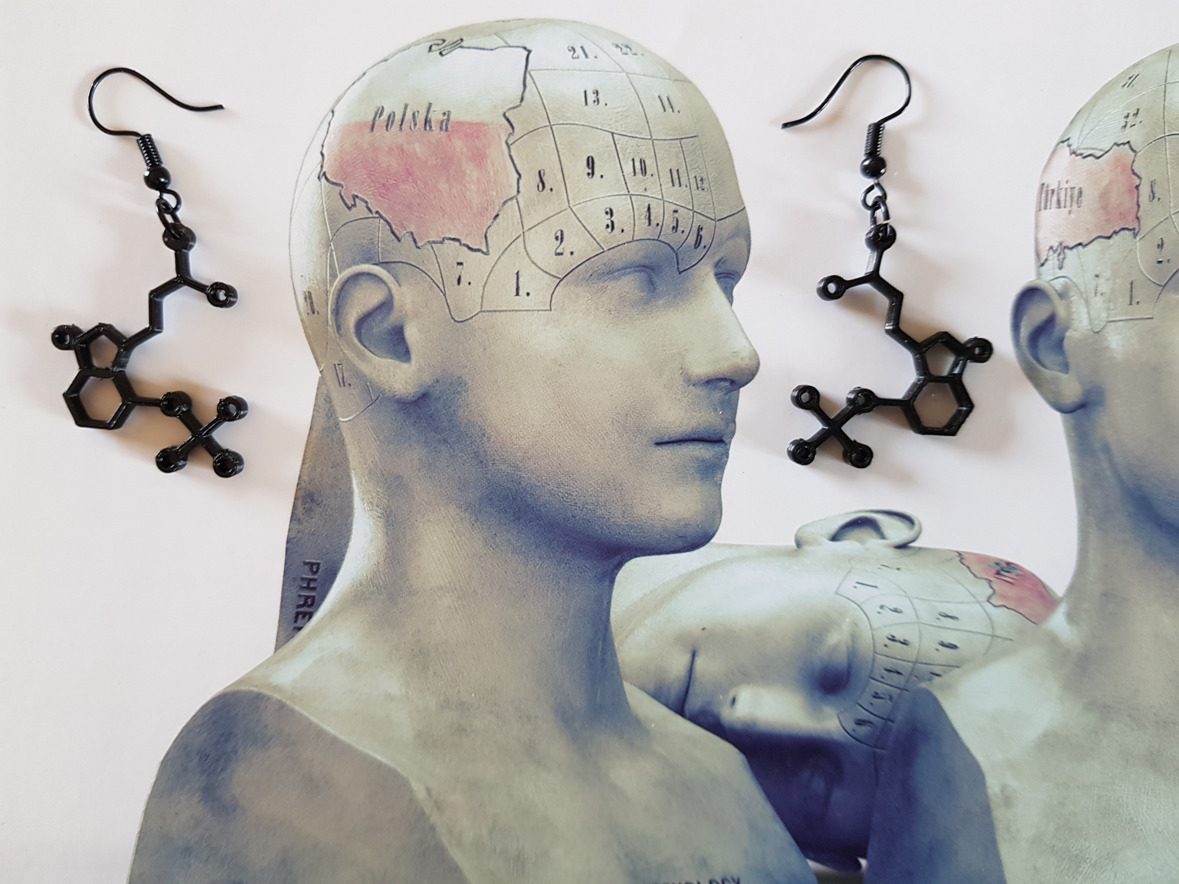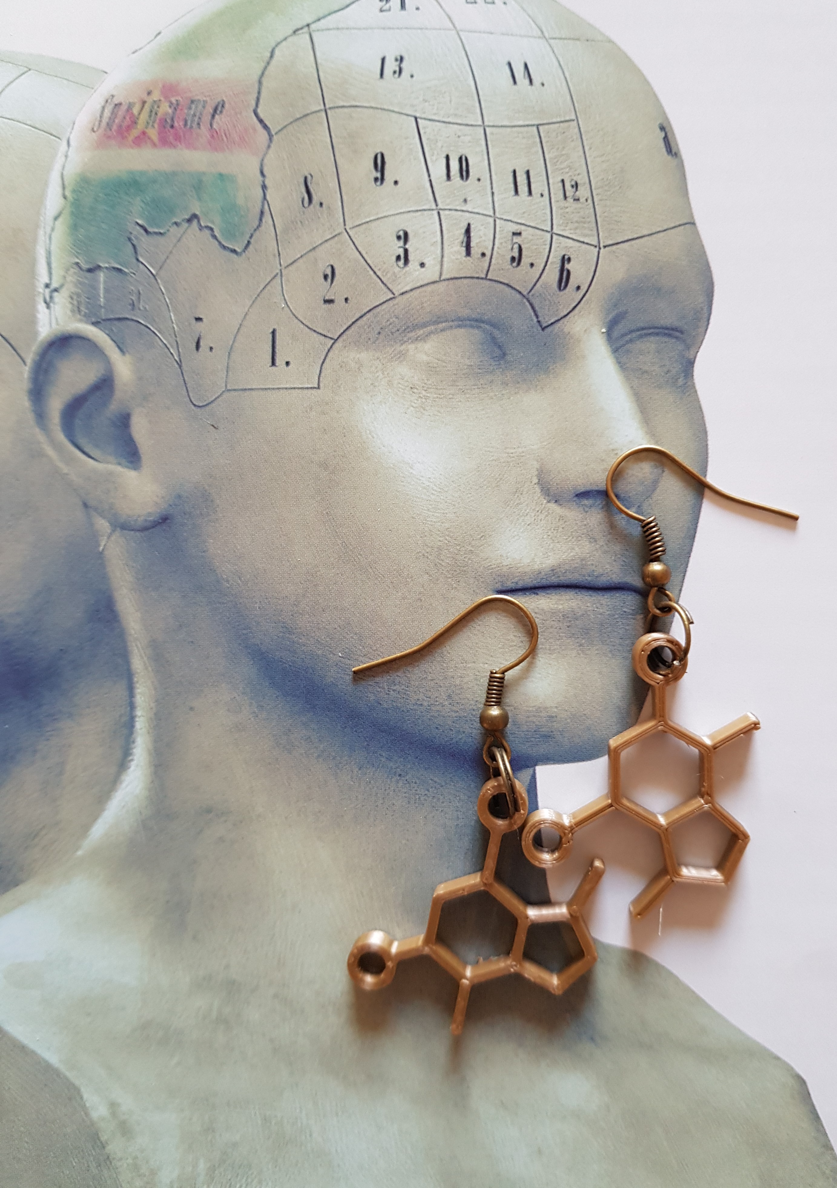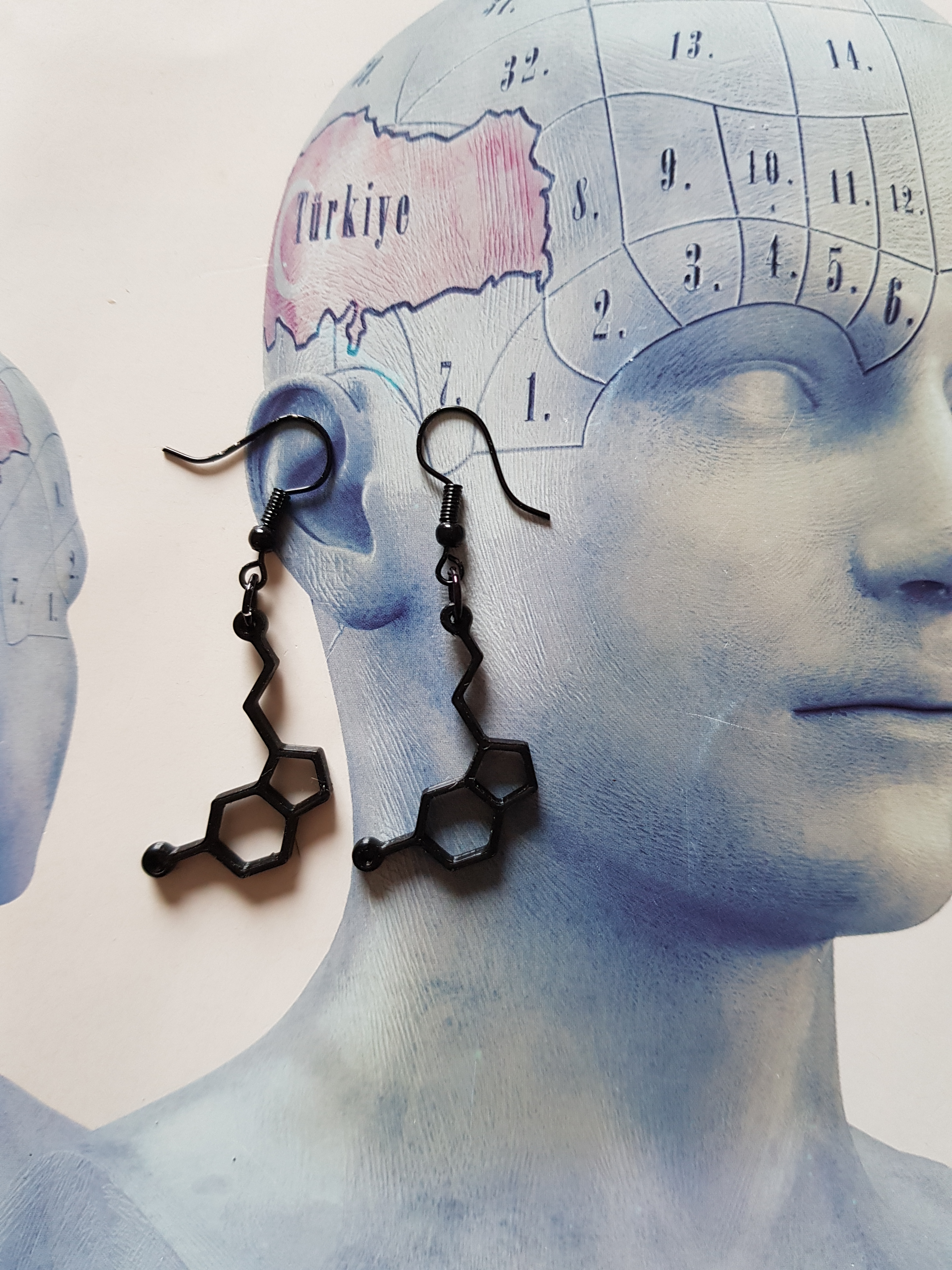 Serotonine is een modern symbool van geluk. Serotonine molecules hebben interacties met receptoren in ons brein voor gevoelens van geluk en blijheid.. Het molecuul heeft ook een elegante vorm. Lengte van het serotonine molecule oorbel is 4 cm. Breedte 2 cm . Het gewicht is minder dan 1 gram voor 2 oorbellen, superlicht dus absoluut geen oor-stress. De Serotonine oorbellen zijn handgemaakt door mij middels het 3D proces met biologisch afbreekbaar filament. ( een soort hergebruikt product) De oorhaakjes zijn zwart grijs staal en nikkelvrij Serotonine is een heel belangrijk stofje in onze hersenen. Het is een neurotransmitter. Deze heeft grote invloed op onze stemmingen, seksueel gedrag, pijntransmissie, slaapgedrag en ons eetgedrag. Serotonine wordt gemaakt uit eiwitten, die in onze voeding voorkomt en worden dan afgebroken tot aminozuren. Een belangrijk aminozuur is tryptofaan. Hieruit wordt 5 http gemaakt en dat wordt in de lever en hersenen omgezet tot serotonine. Ik ga het niet ingewikkelder maken, maar ik weet wel hoeveel ellende het teweegbrengt wanneer je een tekort aan serotonine hebt. Depressie, somberheid, zijn geen fijne zaken. Ik wens je alle geluk met deze serotonine oorbellen Het sieraad wordt verpakt in een handgemaakt zakje.