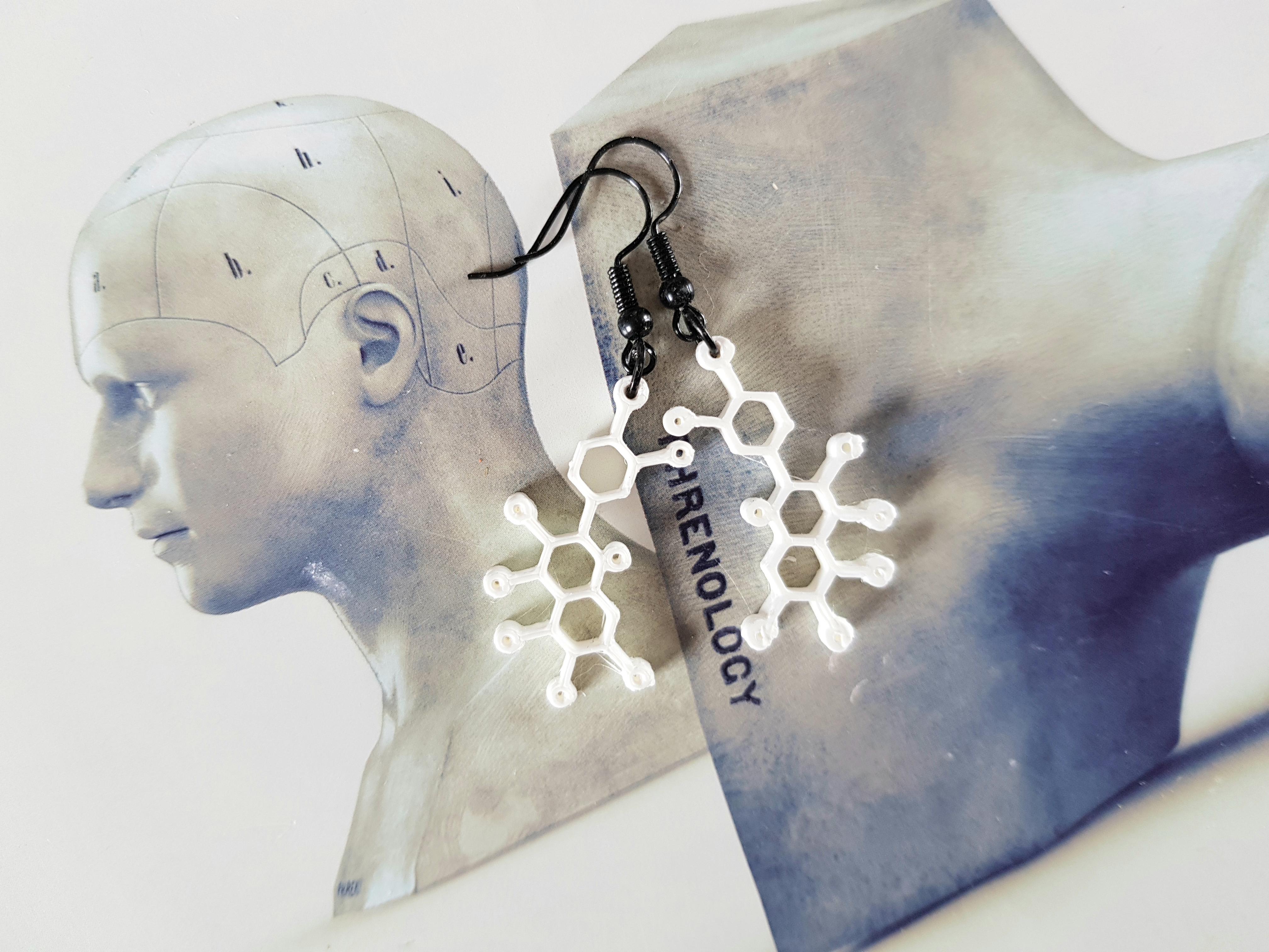 De Adrenaline molecule oorbellen zijn 5 cm lang. En zijn superlicht in gewicht, Geen oor-stress bij 1 gram of minder. De Molecules zijn handgemaakt en ontworpen door mij middels het 3D proces. ( WordPress madebymirjamblog) Adrenaline is een hormoon en neurotransmitter en kan in grote hoeveelheden door het lichaam razen, wanneer we stress ervaren. Ook bij kou, hitte, honger, dorst, en pijn, bij fysieke inspanning, kan de Adrenaline-productie verhoogd zijn. Wanneer stress lang duurt en de adrenaline voortdurend in grote hoeveelheden langdurig door het lichaam raast, berokkent het schade..