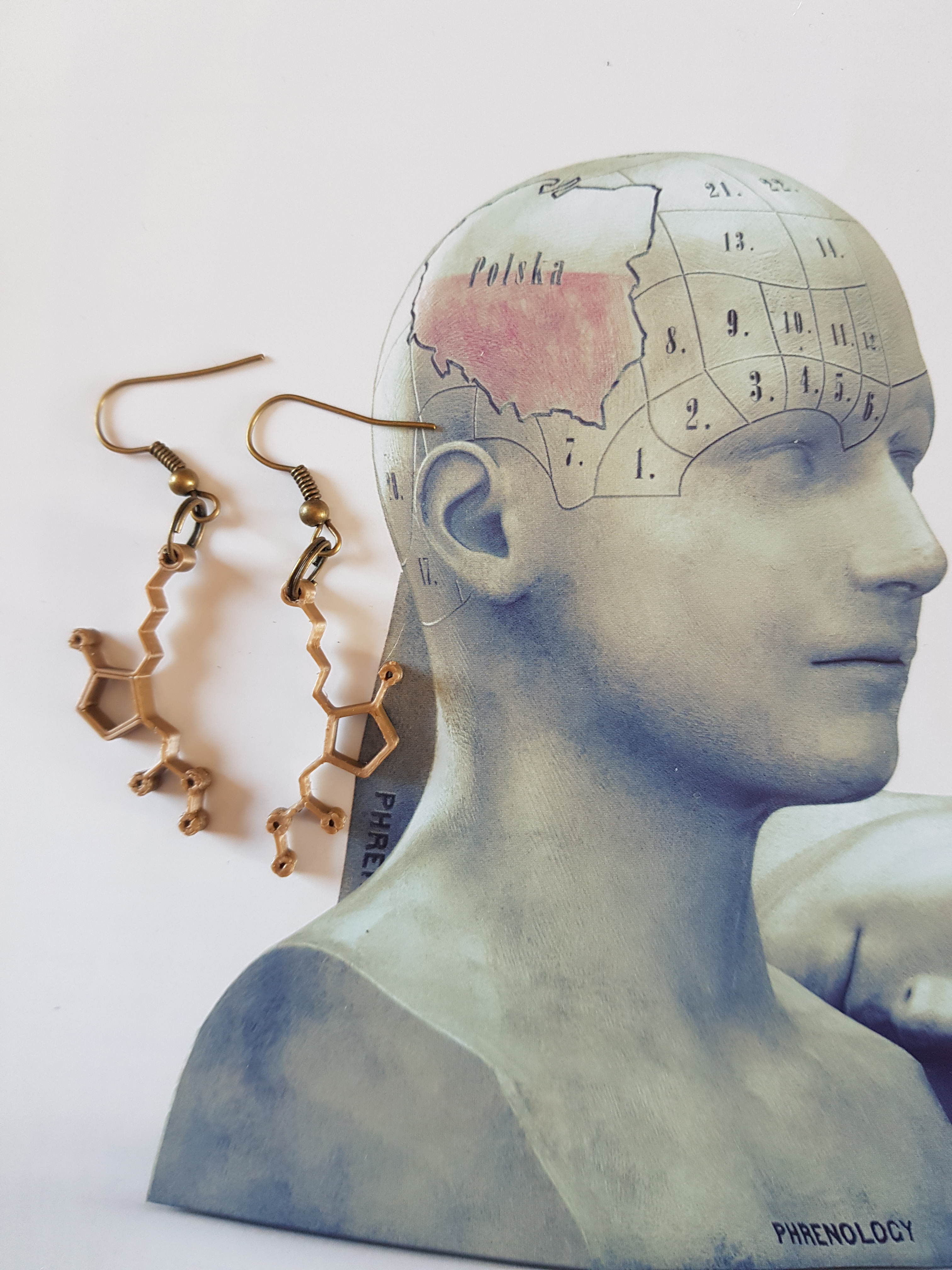 De Dopamine oorbellen zijn 5 cm lang. En zijn superlicht in gewicht, Geen oor-stress bij 1 gram of minder. De Molecules zijn handgemaakt door mij middels het 3D proces. Handgemaakt, dus niet perfect. Ik wens je alle goeds met deze Dopamine ( of combi Dopamine/Serotonine) voor 2022 en de rest van je leven. De oorbellen wordt verpakt in een mooi handgemaakt zakje. Iedereen die wel eens depressief is geweest, weet het belang van Dopamine. De Neurotransmitter Dopamine werkt in het pleziercentrum van ons brein. Het motiveert ons tot plezierige activiteiten zoals eten, kussen, verliefdheid en ……met nieuwe dingen experimenteren……. Ook heeft het een functie bij plezier, bewegings-controle en geheugenattenties.