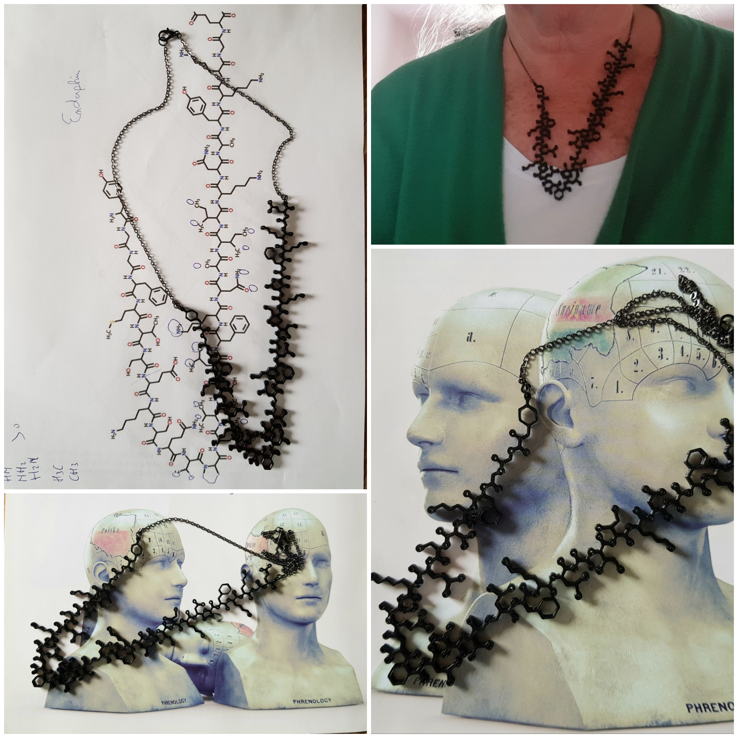 Endorfine molecule ketting is een neurotransmitter sieraad met pijnstiller hormoon. Endorfine is ook een microbiologisch opiaat met pijnstillende eigenschappen, maar heeft ook een rol bij liefde orgasme, opwinding. Endorfines worden geproduceerd door de hypofyse (hypothalamus bij gewervelden) tijdens lichamelijke inspanning, opwinding, pijn, pittig eten, liefde en een orgasme. Ze lijken op opiaten in hun vermogen om pijnstilling te veroorzaken evenals een gevoel van welbevinden en geluk. Het Endorfine molecule is groot en ik vond hem het mooist in een V-vorm. Endorfine molecule is 8 cm.breed Hoogte van het molecule is 16 cm. Het collier valt mooi asymmetrisch in V-vorm om de hals met 45 cm of 18 inch.