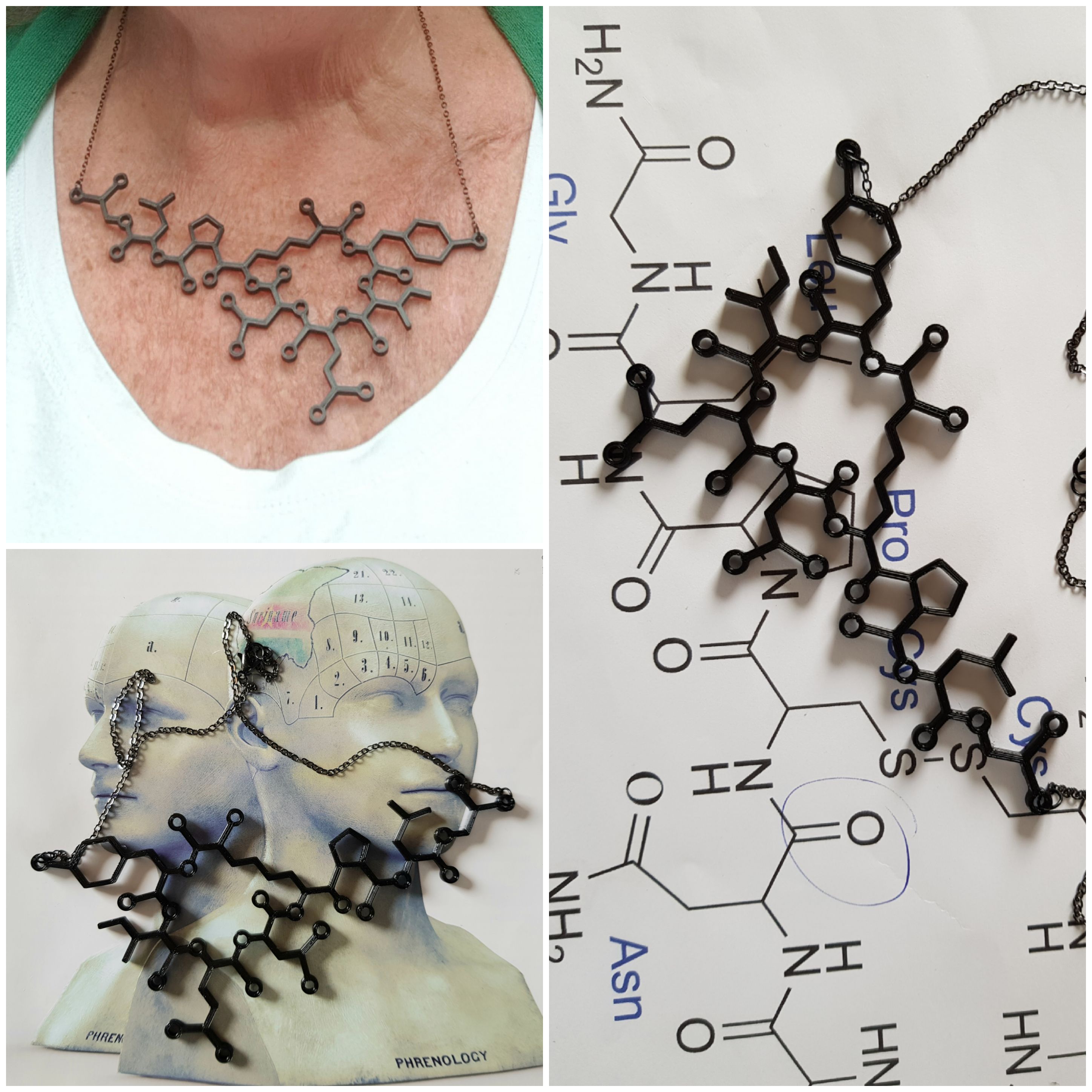 Oxytocine molecule ketting, of te wel het knuffelhormoon sieraad, Oxytocine is ook wel het happy hormoon genoemd. Het Oxytocine hormoon is een neurotransmitter en heeft een belangrijke rol bij het verbinden van sociale contacten met gevoelens van plezier. Het speelt een centrale rol bij moederbinding, vriendschappen, borstvoeding en romantische interacties, evenals bij seksualiteit. Ook bij het verrichten van zorgtaken wordt er meer oxytocine aangemaakt. Omdat oxytocine ook een belangrijke rol speelt bij de hechting van opvoeder en kind, wordt het ook wel het knuffelhormoon genoemd. Waar oxytocine binnen de eigen groep de binding versterkt, kan het richting andere groepen agressief gedrag in de hand werken, vooral als deze groepen als bedreigend worden ervaren. Oxytocine wordt geproduceerd in de hypothalamus. Het wordt vervolgens getransporteerd naar en opgeslagen in Herringlichaampjes bij axon-uiteinden in de neurohypofyse en kan hier worden afgegeven. Oxytocine heeft een aantal functies, waaronder contractie van glad spierweefsel (bijvoorbeeld de baarmoeder), en het regelen van de toeschietreflex bij borstvoeding. Oxytocin molecule is 14 cm breed.. Hoogte van het molecule is 8 cm. Het collier valt mooi om de hals met 51 cm. Hoe ik de molecules maak? Ik heb er een blogpost over geschreven in Corona-tijd op WordPress: https://wordpress.com/post/madebymirjamblog.wordpress.com/8640 Oxytocin is een groot molecule, dus veel uitzoekwerk en aangevuld naar eigen artistiek inzicht. De Molecules zijn handgemaakt door mij middels het 3D proces van bio-afbreekbaar filament. Het is een eigen ontwerp.