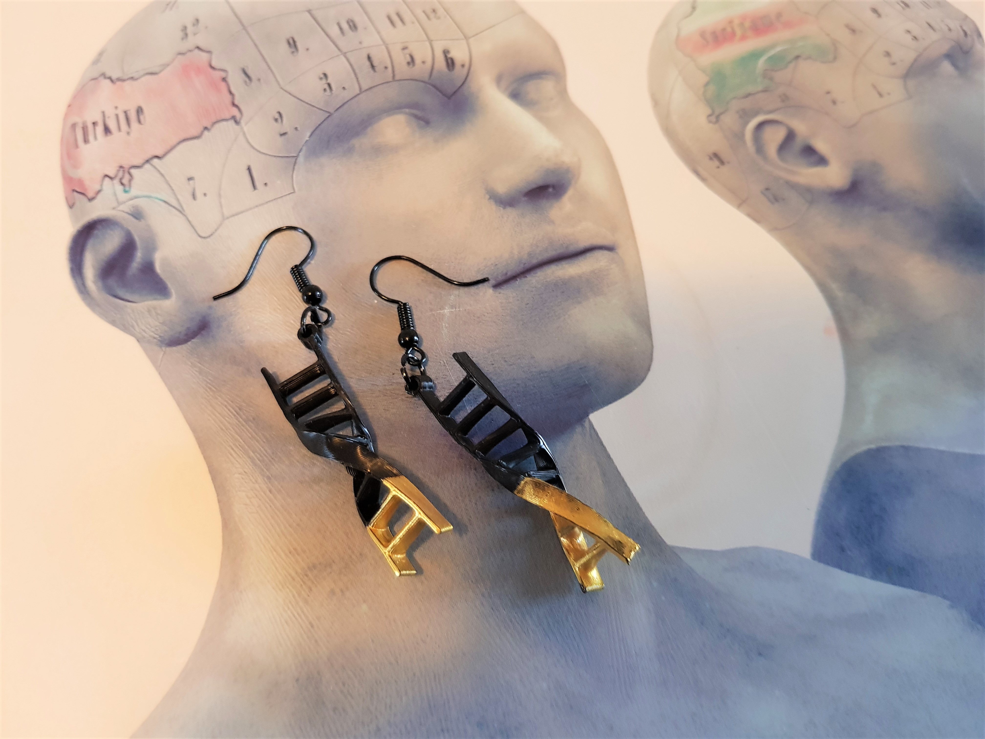 DNA is de belangrijkste drager van ons erfelijk materiaal. Het is het molecuul dat bepaalt welke haar- of huidskleur je hebt, maar ook welke erfelijke ziekten je kan krijgen. Elke DNA oorbel is anders, evenzo als elk menselijk DNA verschillend is. De DNA oorbellen zijn ontworpen door mij en middels het 3D proces van bio-afbreekbaar filament uitgeprint. lengte: 5.5 cm Breedte: 1 cm Gewicht: minder dan 1 gram