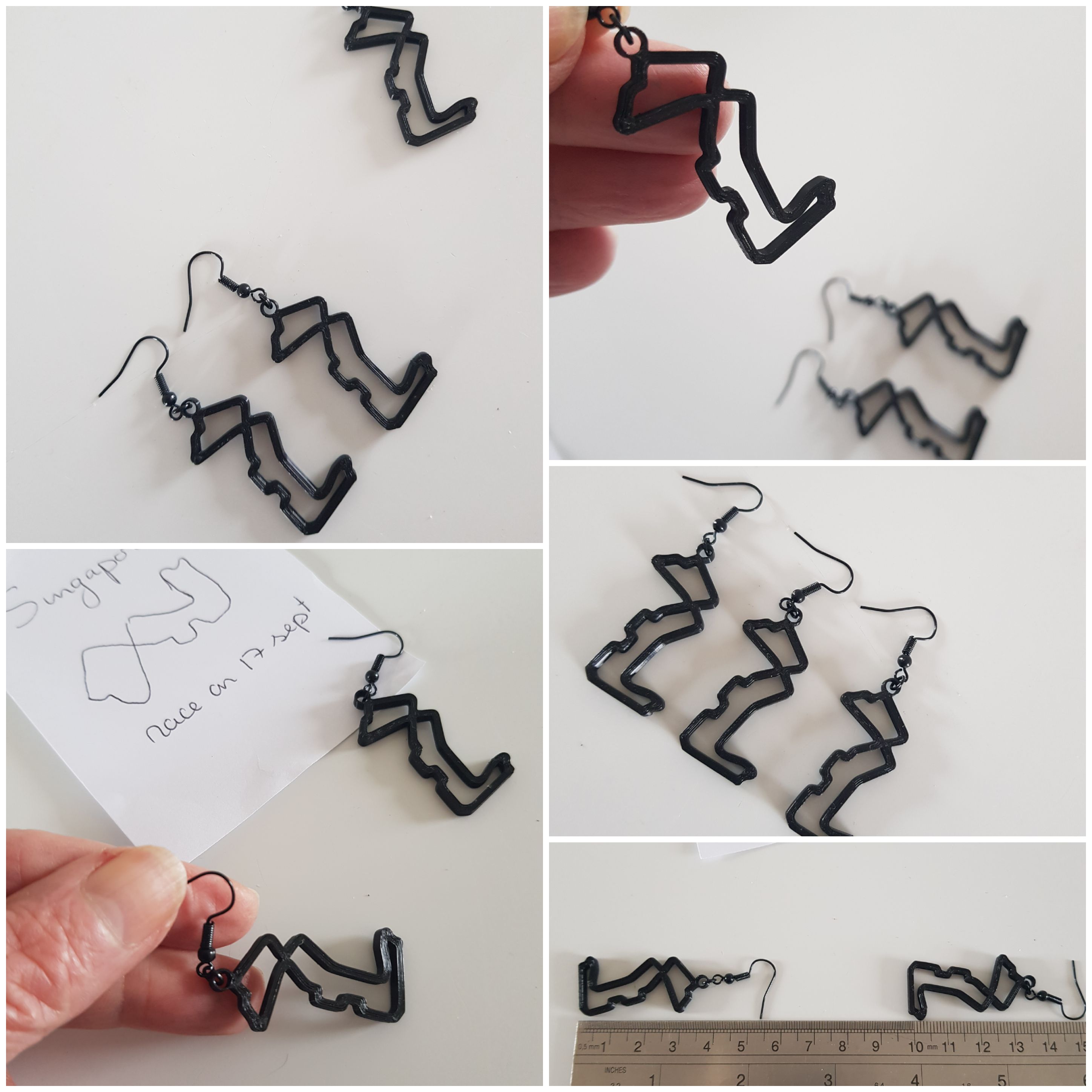 F1 Singapore oorbellen van het Formule1 circuit, Grandprix race sieraad, autoracing, rallycross, autodrome juweeltje MotoGP race-baan Motorsport. Deze F1 oorbellen zijn een uitstekend cadeau voor je GP vrienden en geliefden, die ook van racen houden en af en toe racen of supporter zijn op dit Singapore Straten circuit……. Als U een zilveren broche of zwarte pin-broche van een van dit Singapore cirtcuit wilt, contact me even….U ziet voorbeelden hiervan in mijn shop. De oorbellen zijn gemaakt van nikkelvrij zwart licht staal. Deze circuit oorbellen zijn ongeveer 5.5 cm lang en zijn super lichtgewicht, Breedte is ongeveer 2 cm. Er is geen oor-stress bij 1 gram of minder. Ze zijn fijn licht draagbaar. Het circuit is handgemaakt en ontworpen door mij met behulp van het 3D-proces met biologisch afbreekbaar filament. Ik ben pas in Corona-tijd begonnen met 3D-printen en heb hierover een blogpost geschreven op WordPress. https://wordpress.com/post/madebymirjamblog.wordpress.com/8640 Lengte zwarte oorbellen ca. 6 cm Breedte is 2 cm. Gewicht is minder dan 1 gram voor 2 oorbellen. Dus absoluut geen oor-stress tijdens de race…